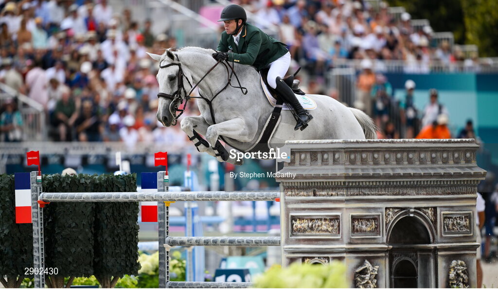 2 August 2024; Shane Sweetnam of Team Ireland riding James Kann Cruz during the jumping team final at the Château de Versailles during the 2024 Paris Summer Olympic Games in Paris, France. Photo by Stephen McCarthy/Sportsfile