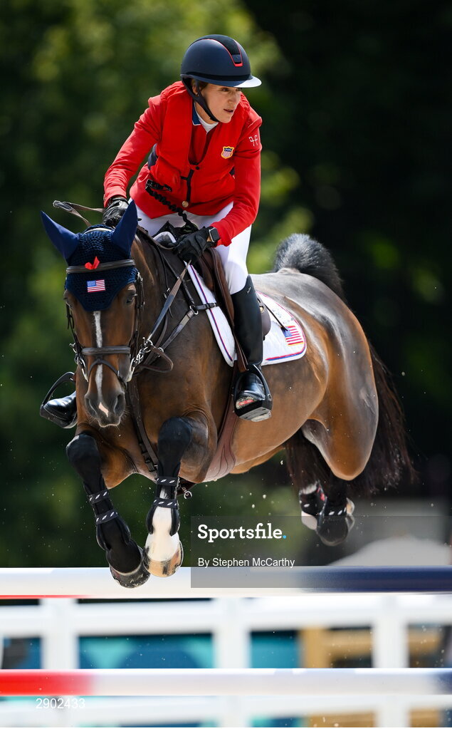 2 August 2024; Laura Kraut of Team USA riding Baloutinue during the jumping team final at the Château de Versailles during the 2024 Paris Summer Olympic Games in Paris, France. Photo by Stephen McCarthy/Sportsfile