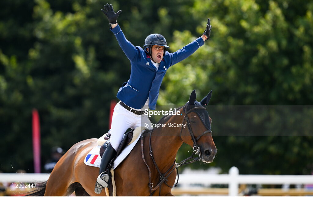 2 August 2024; Olivier Perreau of Team France, on Dorai d'Aiguilly, after competing his run in the jumping team final at the Château de Versailles during the 2024 Paris Summer Olympic Games in Paris, France. Photo by Stephen McCarthy/Sportsfile