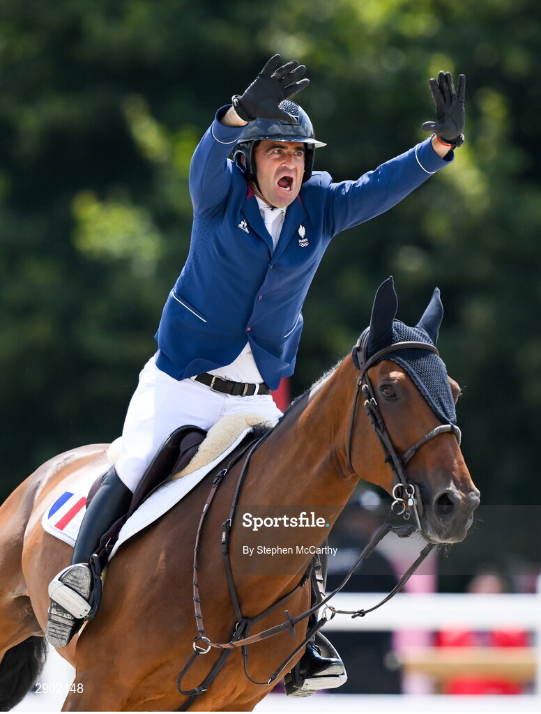 2 August 2024; Olivier Perreau of Team France, on Dorai d'Aiguilly, after competing his run in the jumping team final at the Château de Versailles during the 2024 Paris Summer Olympic Games in Paris, France. Photo by Stephen McCarthy/Sportsfile