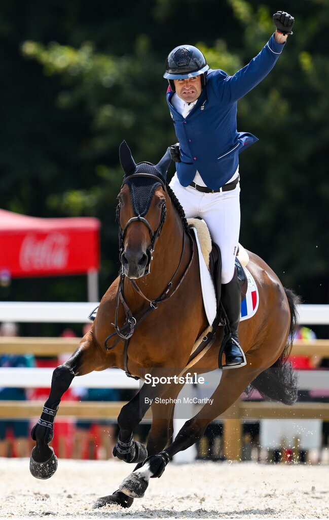 2 August 2024; Olivier Perreau of Team France, on Dorai d'Aiguilly, after competing his run in the jumping team final at the Château de Versailles during the 2024 Paris Summer Olympic Games in Paris, France. Photo by Stephen McCarthy/Sportsfile