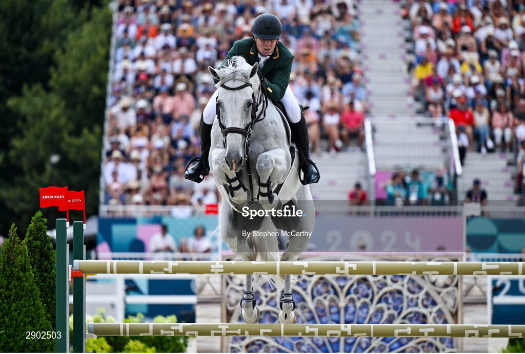 2 August 2024; Shane Sweetnam of Team Ireland, on James Kann Cruz, during the jumping team final at the Château de Versailles during the 2024 Paris Summer Olympic Games in Paris, France. Photo by Stephen McCarthy/Sportsfile