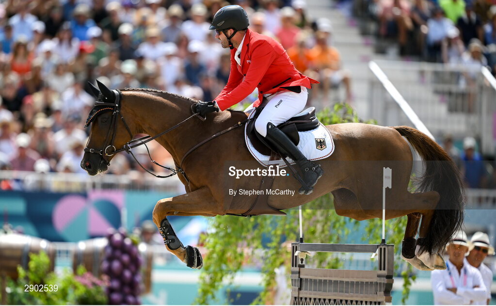 2 August 2024; Philipp Weishaupt of Team Germany, on Zineday, during the jumping team final at the Château de Versailles during the 2024 Paris Summer Olympic Games in Paris, France. Photo by Stephen McCarthy/Sportsfile