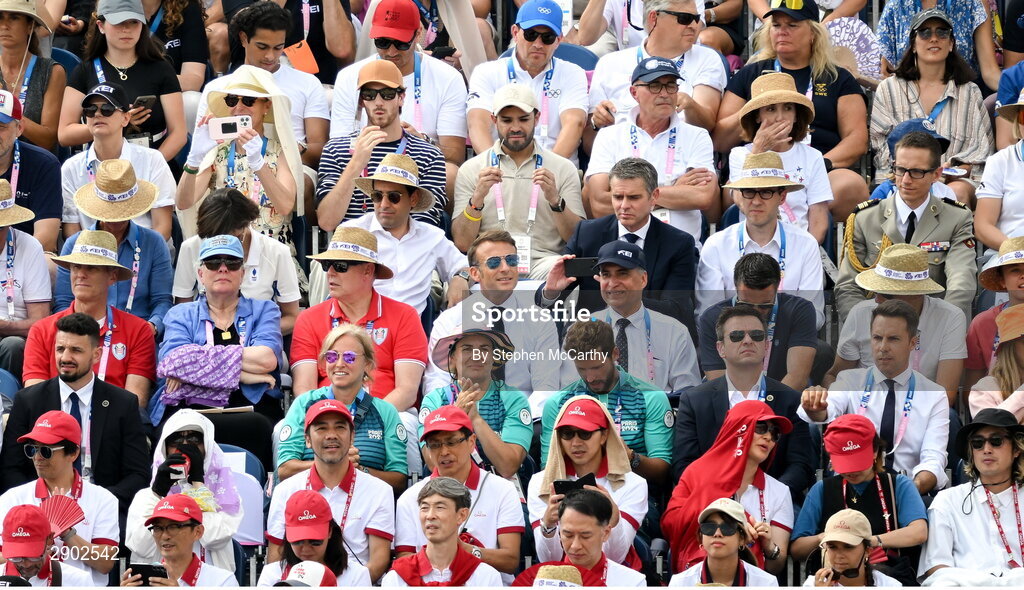 2 August 2024; President of France Emmanuel Macron watches on during the jumping team final at the Château de Versailles during the 2024 Paris Summer Olympic Games in Paris, France. Photo by Stephen McCarthy/Sportsfile