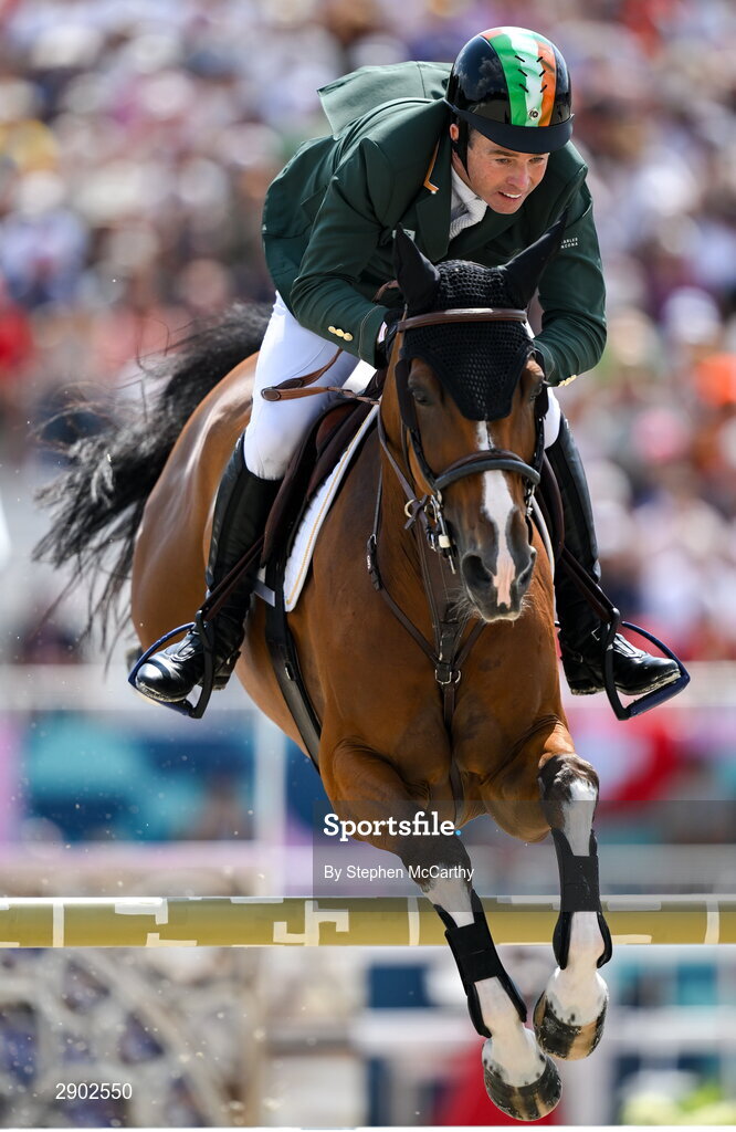 2 August 2024; Cian O'Connor of Team Ireland, on Maurice, during the jumping team final at the Château de Versailles during the 2024 Paris Summer Olympic Games in Paris, France. Photo by Stephen McCarthy/Sportsfile