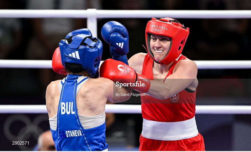 2 August 2024; Michaela Walsh of Team Ireland, right, in action against Svetlana Kamenova Staneva of Team Bulgaria during their women's 57Kg round of 16 bout at the North Paris Arena during the 2024 Paris Summer Olympic Games in Paris, France. Photo by David Fitzgerald/Sportsfile