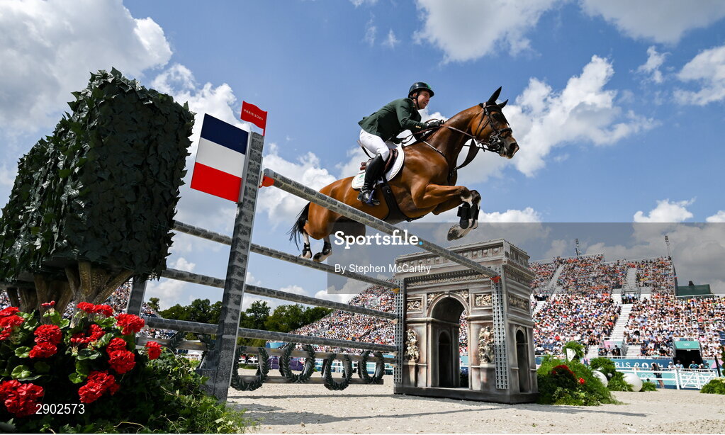 2 August 2024; Cian O'Connor of Team Ireland, on Maurice, during the jumping team final at the Château de Versailles during the 2024 Paris Summer Olympic Games in Paris, France. Photo by Stephen McCarthy/Sportsfile