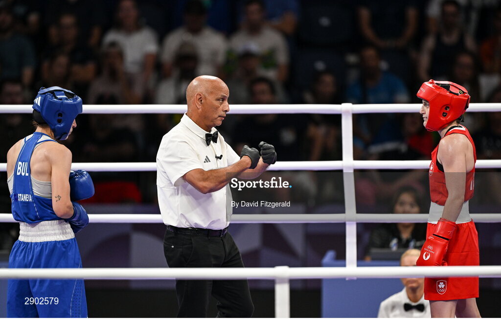2 August 2024; Referee Bachir Abar tells Michaela Walsh of Team Ireland, right, and Svetlana Kamenova Staneva of Team Bulgaria to engage during their women's 57Kg round of 16 bout at the North Paris Arena during the 2024 Paris Summer Olympic Games in Paris, France. Photo by David Fitzgerald/Sportsfile