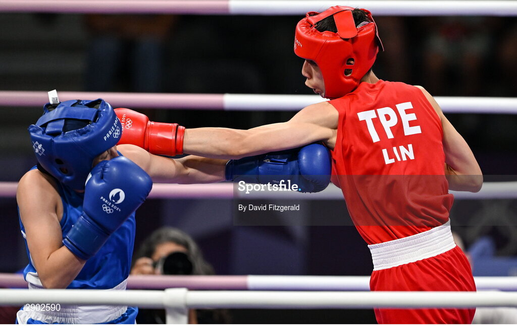 2 August 2024; Yu Ting Lin of Team Chinese Taipei, right, in action against Sitora Turdibekova of Team Uzbekistan during her women's 57kg preliminary round of 16 bout at the North Paris Arena during the 2024 Paris Summer Olympic Games in Paris, France. Photo by David Fitzgerald/Sportsfile