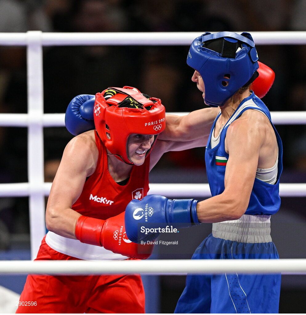 2 August 2024; Michaela Walsh of Team Ireland, left, in action against Svetlana Kamenova Staneva of Team Bulgaria during their women's 57Kg round of 16 bout at the North Paris Arena during the 2024 Paris Summer Olympic Games in Paris, France. Photo by David Fitzgerald/Sportsfile