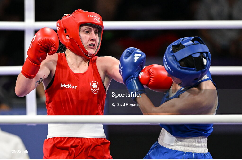 2 August 2024; Michaela Walsh of Team Ireland, left, in action against Svetlana Kamenova Staneva of Team Bulgaria during their women's 57Kg round of 16 bout at the North Paris Arena during the 2024 Paris Summer Olympic Games in Paris, France. Photo by David Fitzgerald/Sportsfile