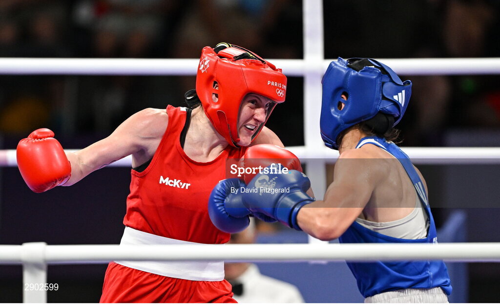 2 August 2024; Michaela Walsh of Team Ireland, left, in action against Svetlana Kamenova Staneva of Team Bulgaria during their women's 57Kg round of 16 bout at the North Paris Arena during the 2024 Paris Summer Olympic Games in Paris, France. Photo by David Fitzgerald/Sportsfile