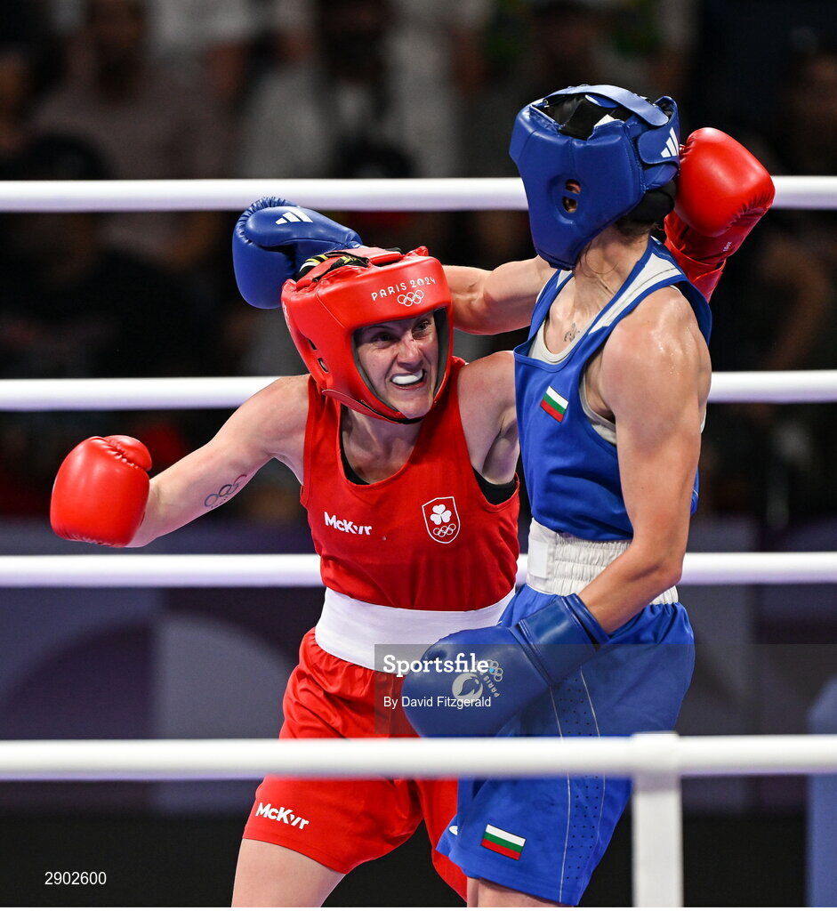 2 August 2024; Michaela Walsh of Team Ireland, left, in action against Svetlana Kamenova Staneva of Team Bulgaria during their women's 57Kg round of 16 bout at the North Paris Arena during the 2024 Paris Summer Olympic Games in Paris, France. Photo by David Fitzgerald/Sportsfile