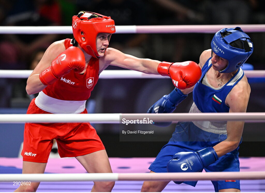 2 August 2024; Michaela Walsh of Team Ireland, left, in action against Svetlana Kamenova Staneva of Team Bulgaria during their women's 57Kg round of 16 bout at the North Paris Arena during the 2024 Paris Summer Olympic Games in Paris, France. Photo by David Fitzgerald/Sportsfile