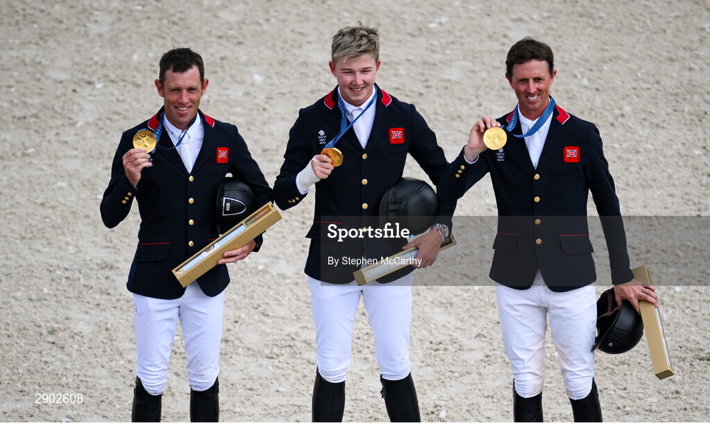 2 August 2024; Gold medalists Scott Brash, Harry Charles and Ben Maher of Team Great Britain after the jumping team final at the Château de Versailles during the 2024 Paris Summer Olympic Games in Paris, France. Photo by Stephen McCarthy/Sportsfile