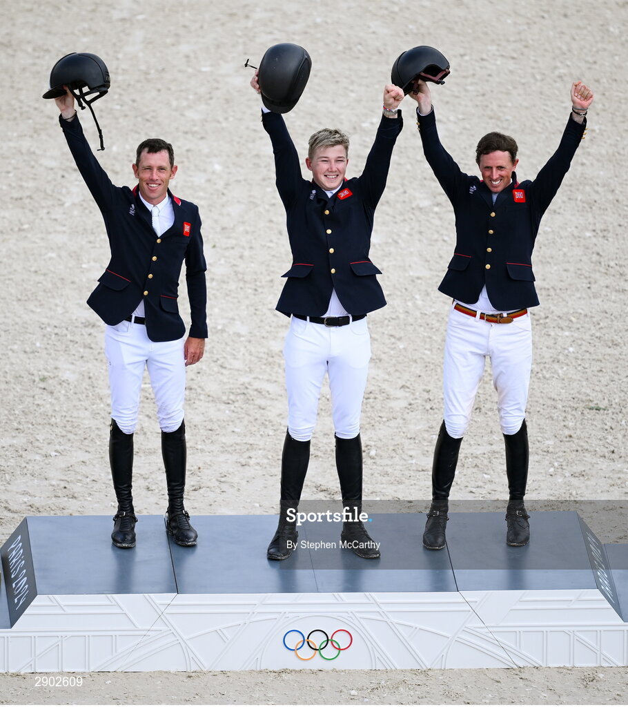 2 August 2024; Gold medalists Scott Brash, Harry Charles and Ben Maher of Team Great Britain after the jumping team final at the Château de Versailles during the 2024 Paris Summer Olympic Games in Paris, France. Photo by Stephen McCarthy/Sportsfile