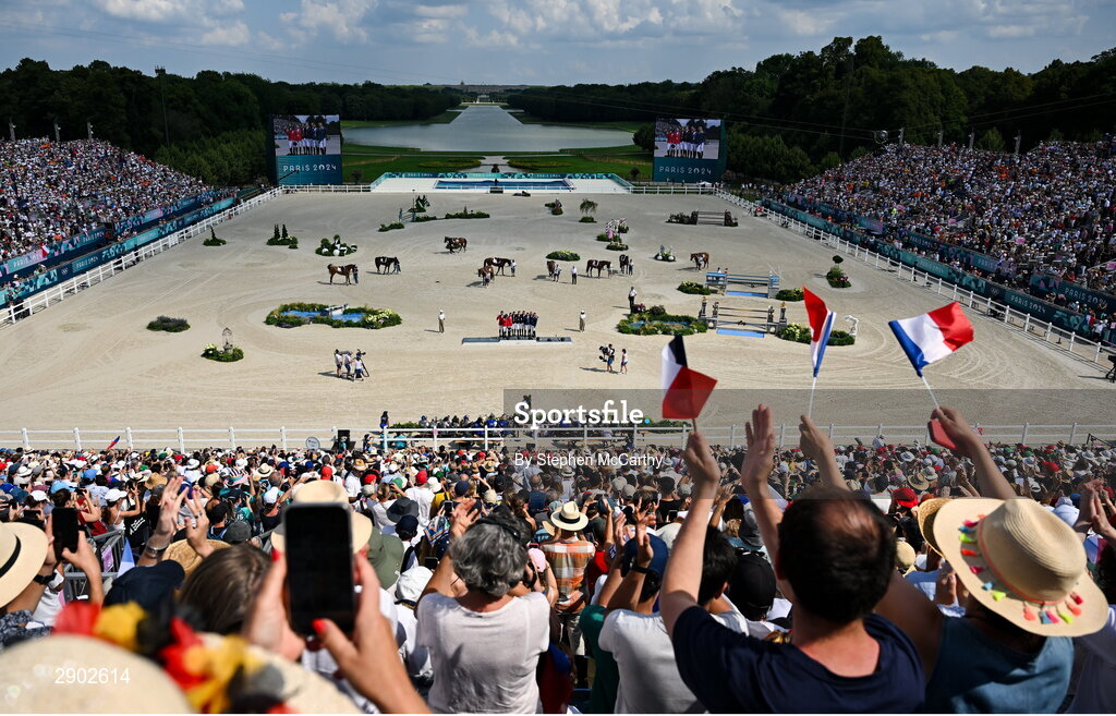 2 August 2024; A general view of the podium after the jumping team final at the Château de Versailles during the 2024 Paris Summer Olympic Games in Paris, France. Photo by Stephen McCarthy/Sportsfile