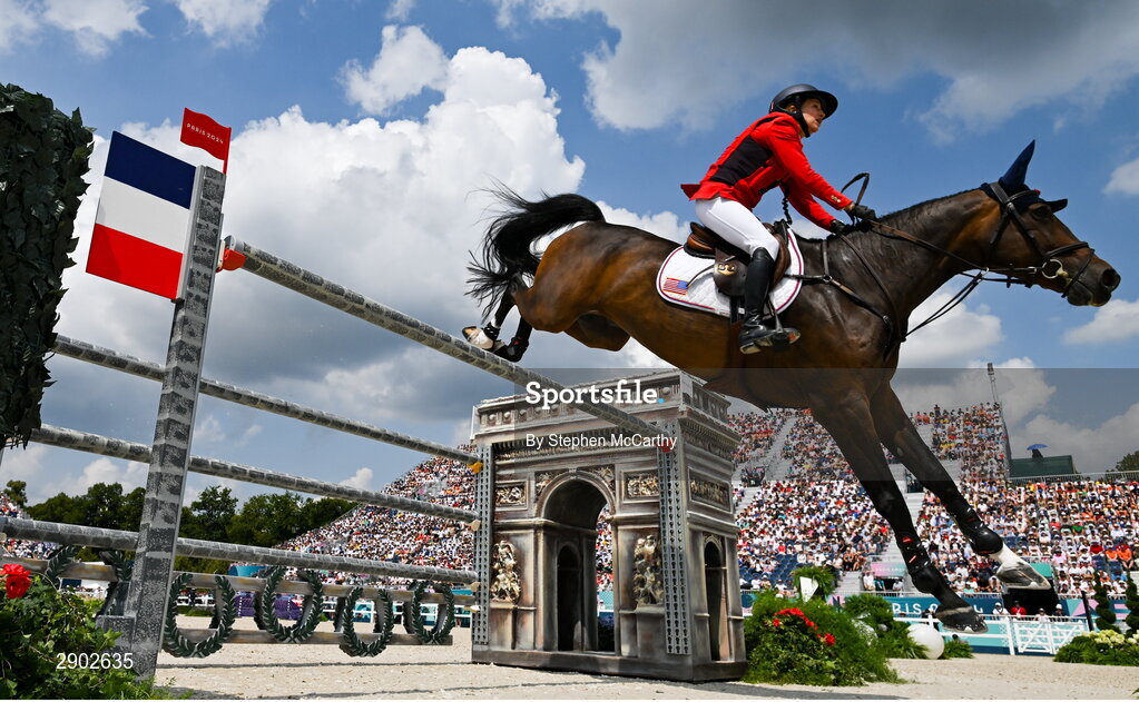 2 August 2024; Laura Kraut of Team USA, on Baloutinue, during the jumping team final at the Château de Versailles during the 2024 Paris Summer Olympic Games in Paris, France. Photo by Stephen McCarthy/Sportsfile