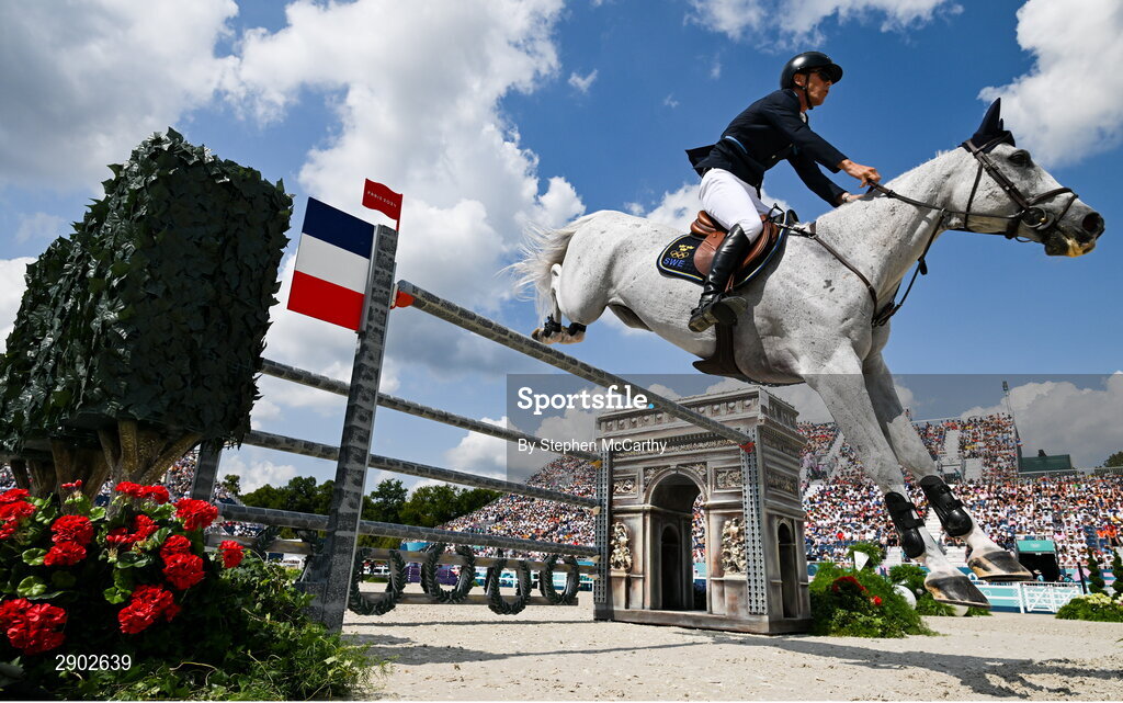 2 August 2024; Peder Fredricson of Team Sweden, on Catch Me Not S, during the jumping team final at the Château de Versailles during the 2024 Paris Summer Olympic Games in Paris, France. Photo by Stephen McCarthy/Sportsfile