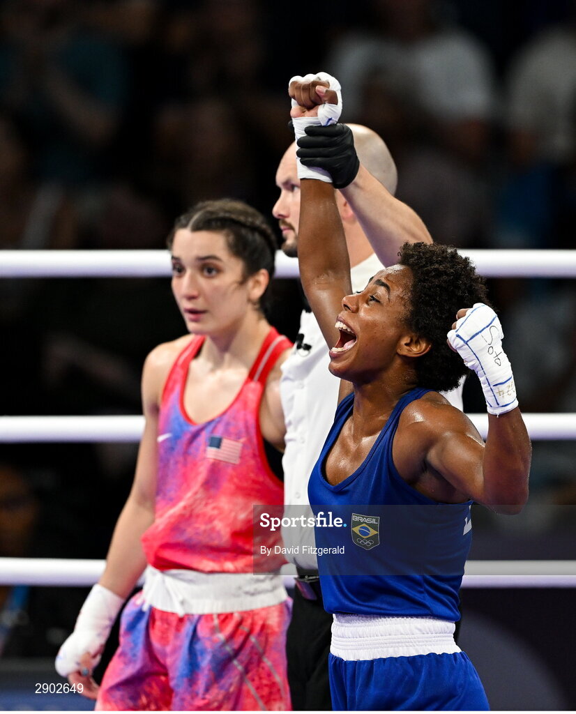 2 August 2024; Jucielen Cerqueira Romeu of Team Brazil celebrates winning against Alyssa Mendoza of Team USA after their women's 57kg preliminary round of 16 bout at the North Paris Arena during the 2024 Paris Summer Olympic Games in Paris, France. Photo by David Fitzgerald/Sportsfile