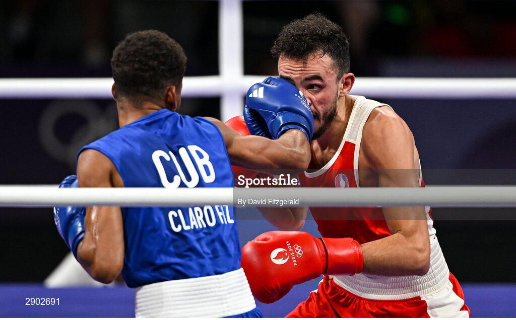 2 August 2024; Billal Bennama of Team France, right, in action against Alejandro Claro Fiz of Team Cuba during their men's 51kg quarterfinal bout at the North Paris Arena during the 2024 Paris Summer Olympic Games in Paris, France. Photo by David Fitzgerald/Sportsfile