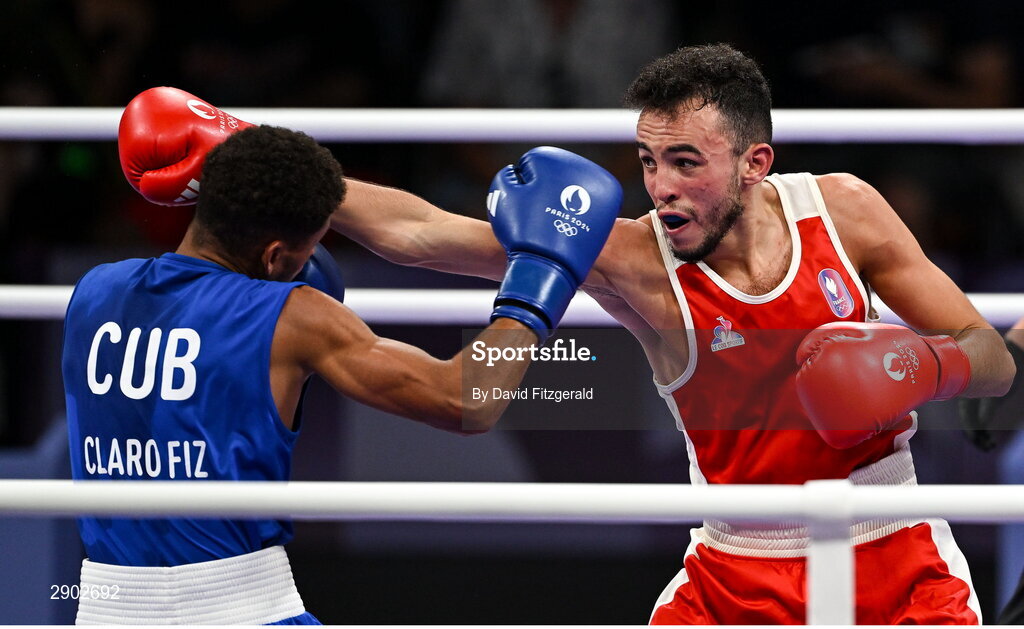 2 August 2024; Billal Bennama of Team France, right, in action against Alejandro Claro Fiz of Team Cuba during their men's 51kg quarterfinal bout at the North Paris Arena during the 2024 Paris Summer Olympic Games in Paris, France. Photo by David Fitzgerald/Sportsfile