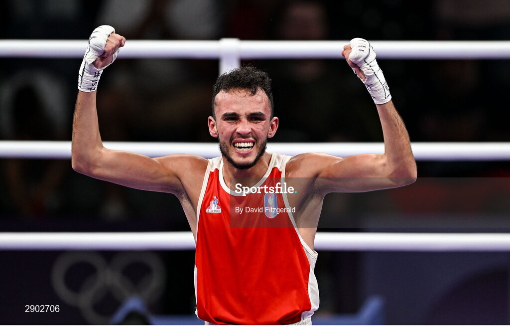 2 August 2024; Billal Bennama of Team France celebrates winning against Alejandro Claro Fiz of Team Cuba after their men's 51kg quarterfinal bout at the North Paris Arena during the 2024 Paris Summer Olympic Games in Paris, France. Photo by David Fitzgerald/Sportsfile