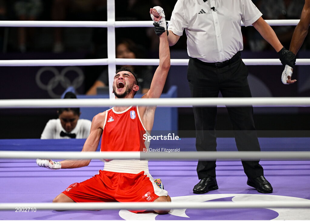 2 August 2024; Billal Bennama of Team France celebrates winning against Alejandro Claro Fiz of Team Cuba after their men's 51kg quarterfinal bout at the North Paris Arena during the 2024 Paris Summer Olympic Games in Paris, France. Photo by David Fitzgerald/Sportsfile