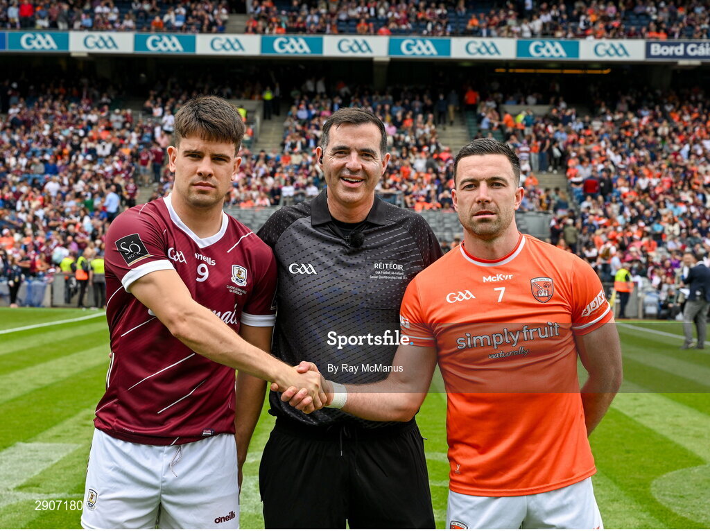 28 July 2024; Referee Sean Hurson with the two captains Sean Kelly of Galway and Aidan Forker of Armagh before the GAA Football All-Ireland Senior Championship Final match between Armagh and Galway at Croke Park in Dublin. Photo by Ray McManus/Sportsfile