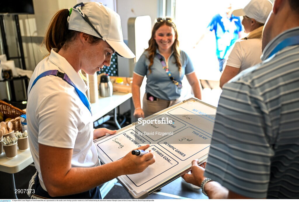 6 August 2024; Leona Maguire of Team Ireland fills out a questionnaire at the media centre during a practice round at Le Golf National during the 2024 Paris Summer Olympic Games in Paris, France. Photo by David Fitzgerald/Sportsfile