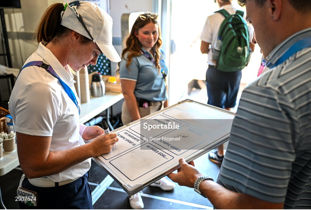 6 August 2024; Leona Maguire of Team Ireland fills out a questionnaire at the media centre during a practice round at Le Golf National during the 2024 Paris Summer Olympic Games in Paris, France. Photo by David Fitzgerald/Sportsfile