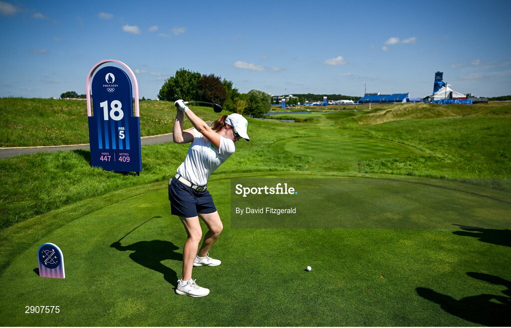 6 August 2024; Leona Maguire of Team Ireland drives from the 18th tee box during a practice round at Le Golf National during the 2024 Paris Summer Olympic Games in Paris, France. Photo by David Fitzgerald/Sportsfile
