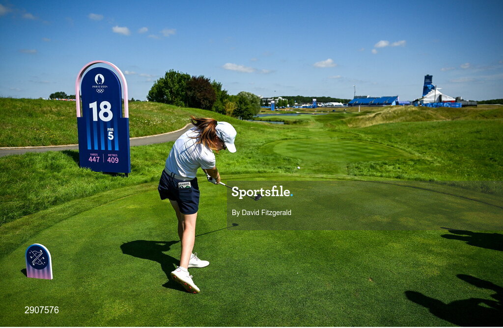 6 August 2024; Leona Maguire of Team Ireland drives from the 18th tee box during a practice round at Le Golf National during the 2024 Paris Summer Olympic Games in Paris, France. Photo by David Fitzgerald/Sportsfile