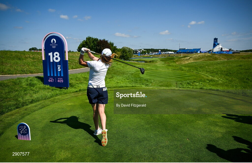 6 August 2024; Leona Maguire of Team Ireland watches her drive from the 18th tee box during a practice round at Le Golf National during the 2024 Paris Summer Olympic Games in Paris, France. Photo by David Fitzgerald/Sportsfile