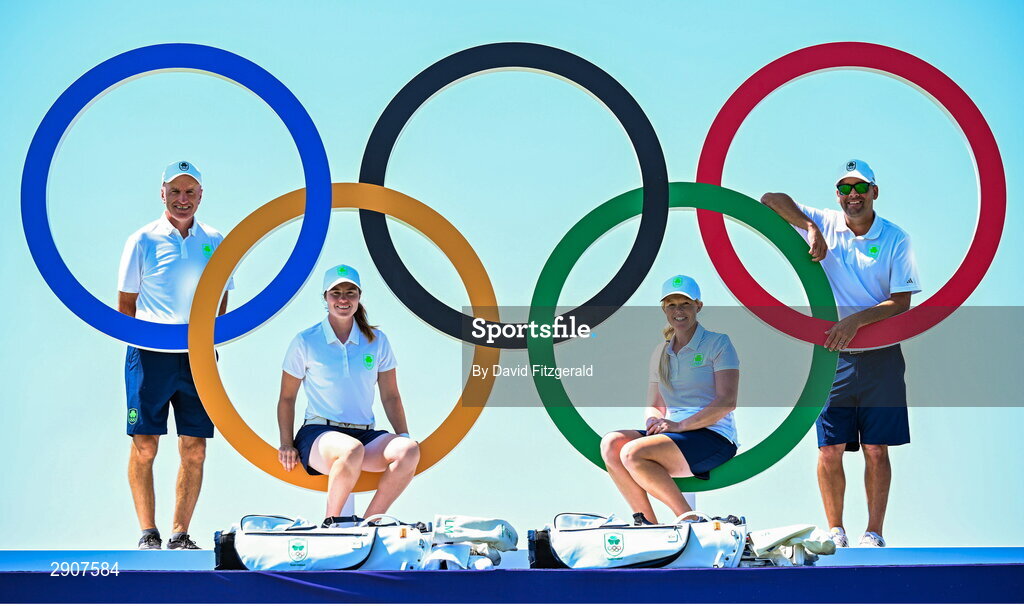 6 August 2024; Team Ireland golfers Leona Maguire, second from left, and Stephanie Meadow, second from right, with, caddie Verners Tess, left, and caddie Ben Lown during a practice round at Le Golf National during the 2024 Paris Summer Olympic Games in Paris, France. Photo by David Fitzgerald/Sportsfile