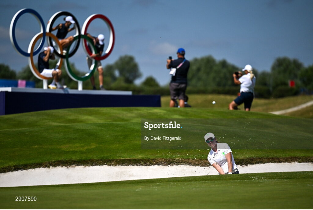 6 August 2024; Leona Maguire of Team Ireland plays a shot from a bunker on the 18th during a practice round at Le Golf National during the 2024 Paris Summer Olympic Games in Paris, France. Photo by David Fitzgerald/Sportsfile