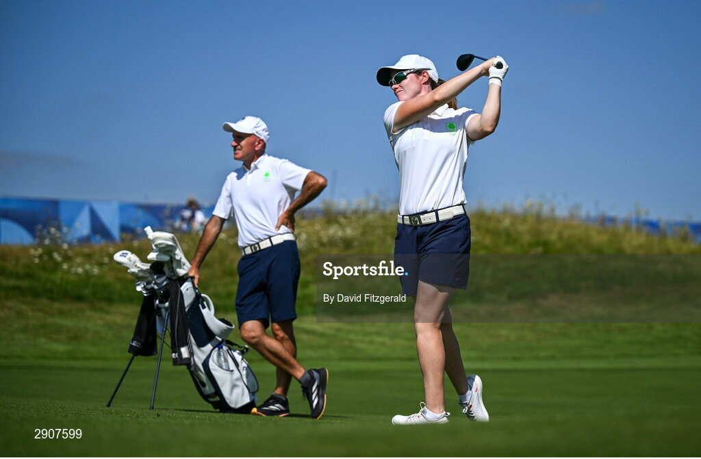 6 August 2024; Leona Maguire of Team Ireland plays a shot from the 18th fairway during a practice round at Le Golf National during the 2024 Paris Summer Olympic Games in Paris, France. Photo by David Fitzgerald/Sportsfile