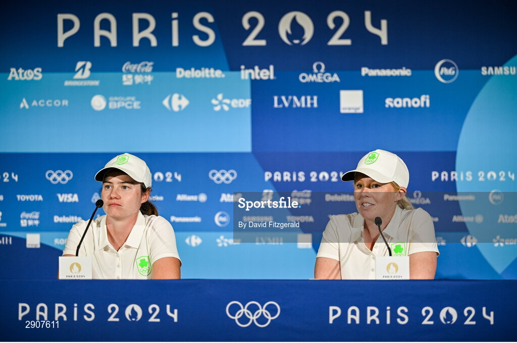 6 August 2024; Team Ireland golfers Leona Maguire, left, and Stephanie Meadow during a press conference following a practice round at Le Golf National during the 2024 Paris Summer Olympic Games in Paris, France. Photo by David Fitzgerald/Sportsfile