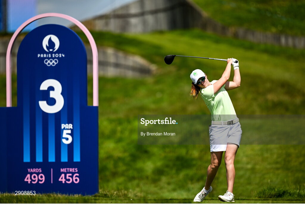 7 August 2024; Leona Maguire of Team Ireland watches her drive from the third tee box during round one of the women's individual strokeplay at Le Golf National during the 2024 Paris Summer Olympic Games in Paris, France. Photo by Brendan Moran/Sportsfile