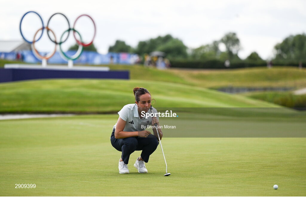 7 August 2024; Georgia Hall of Team Great Britain lines-up a putt on the eighteenth green during round one of the women's individual strokeplay at Le Golf National during the 2024 Paris Summer Olympic Games in Paris, France. Photo by Brendan Moran/Sportsfile
