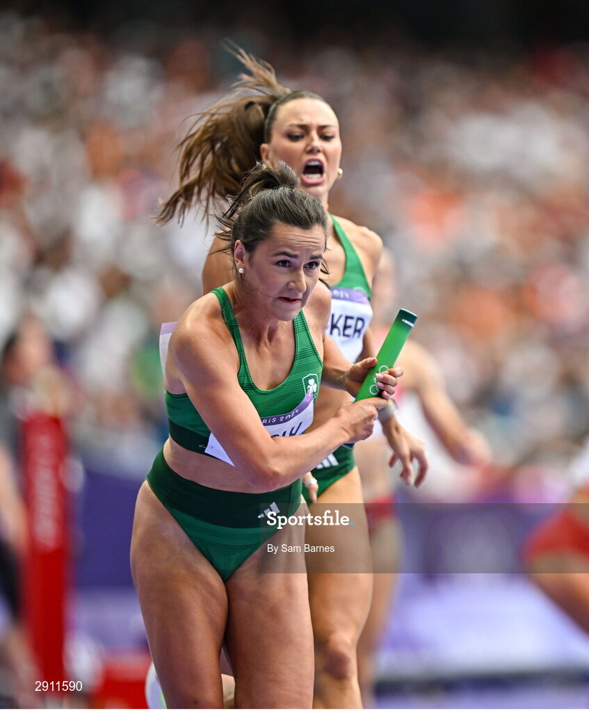 9 August 2024; Phil Healy of Team Ireland receives the baton from Sophie Becker of Team Ireland in action during the women's 4 x 400m relay round 1 at the Stade de France during the 2024 Paris Summer Olympic Games in Paris, France. Photo by Sam Barnes/Sportsfile