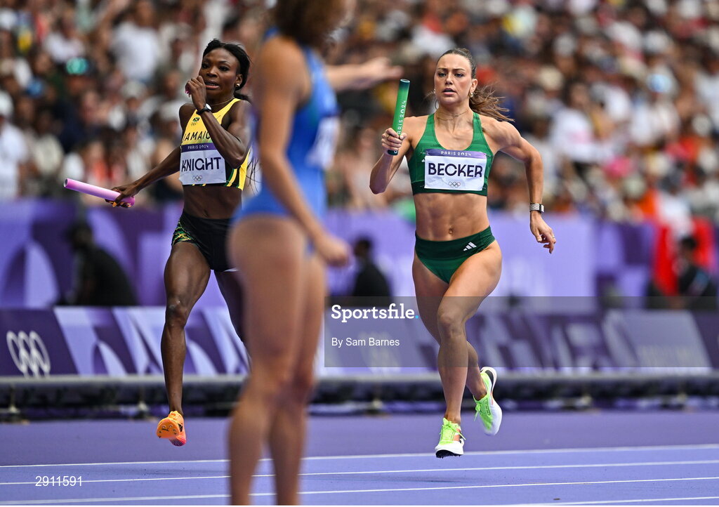 9 August 2024; Sophie Becker of Team Ireland, right, and Andrenette Knight of Team Jamaica in action during the women's 4 x 400m relay round 1 at the Stade de France during the 2024 Paris Summer Olympic Games in Paris, France. Photo by Sam Barnes/Sportsfile