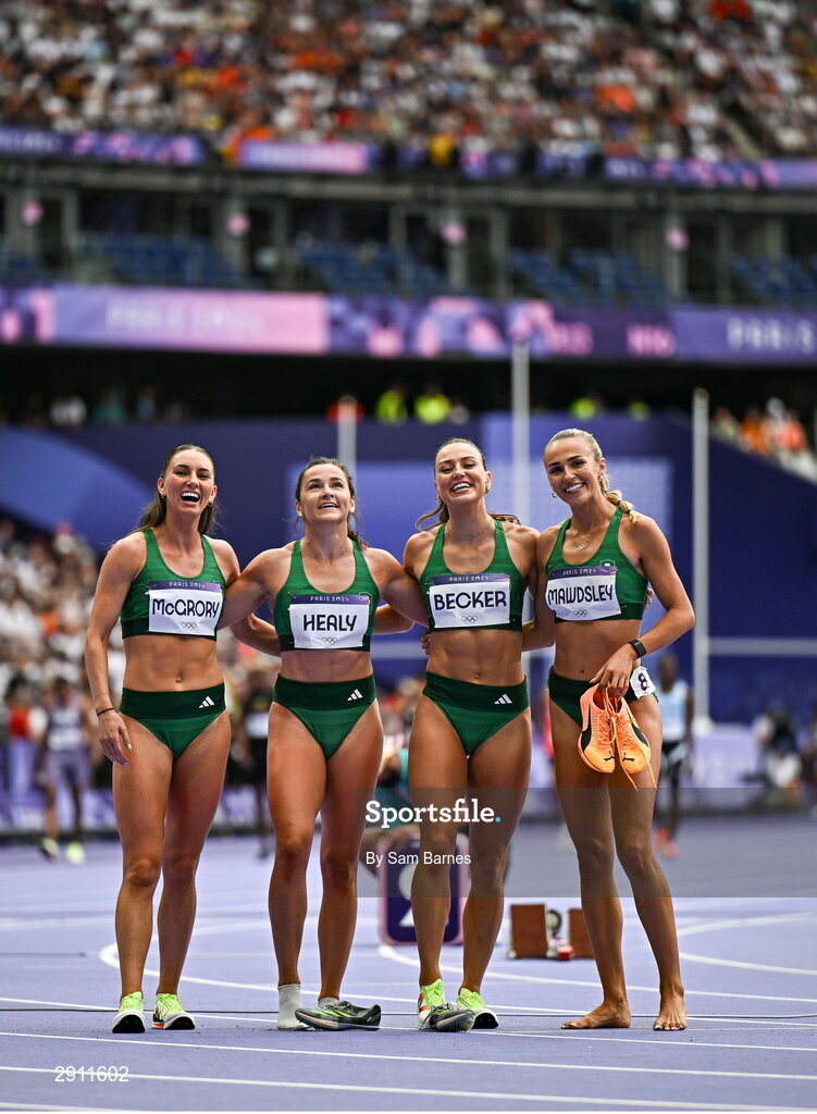 9 August 2024; Team Ireland relay team, from left, Kelly McGrory, Phil Healy, Sophie Becker and Sharlene Mawdsley after qualifiying for the final in the women's 4 x 400m relay round 1 at the Stade de France during the 2024 Paris Summer Olympic Games in Paris, France. Photo by Sam Barnes/Sportsfile