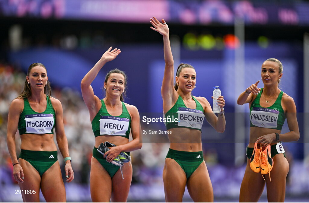9 August 2024; Team Ireland relay team, from left, Kelly McGrory, Phil Healy, Sophie Becker and Sharlene Mawdsley after qualifiying for the final in the women's 4 x 400m relay round 1 at the Stade de France during the 2024 Paris Summer Olympic Games in Paris, France. Photo by Sam Barnes/Sportsfile