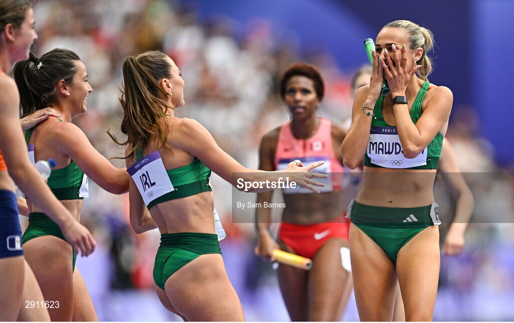9 August 2024; Sharlene Mawdsley of Team Ireland is congratulated by Sophie Becker, centre, and Phil Healy after qualifying for the final in the women's 4 x 400m relay round 1 at the Stade de France during the 2024 Paris Summer Olympic Games in Paris, France. Photo by Sam Barnes/Sportsfile