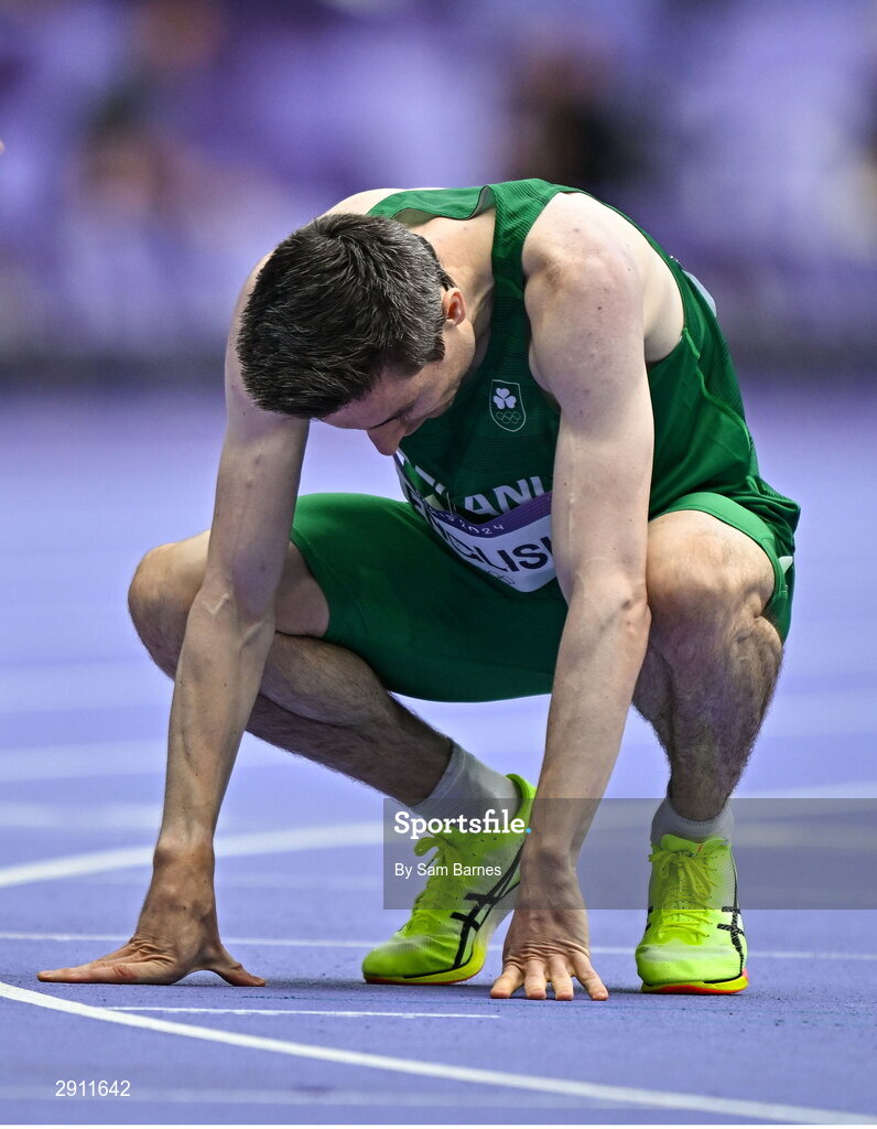 9 August 2024; Mark English of Team Ireland reacts after failing to qualify in the men's 800m semi-final at the Stade de France during the 2024 Paris Summer Olympic Games in Paris, France. Photo by Sam Barnes/Sportsfile