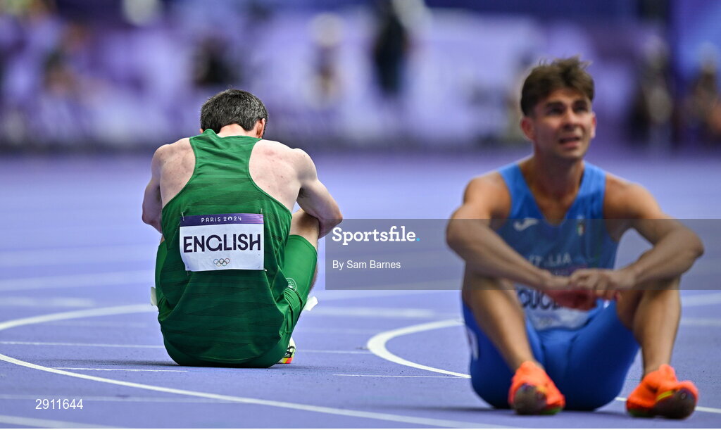 9 August 2024; Mark English of Team Ireland reacts after failing to qualify in the men's 800m semi-final at the Stade de France during the 2024 Paris Summer Olympic Games in Paris, France. Photo by Sam Barnes/Sportsfile