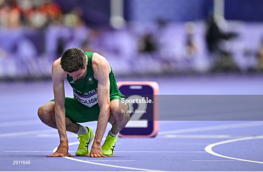 9 August 2024; Mark English of Team Ireland reacts after failing to qualify in the men's 800m semi-final at the Stade de France during the 2024 Paris Summer Olympic Games in Paris, France. Photo by Sam Barnes/Sportsfile