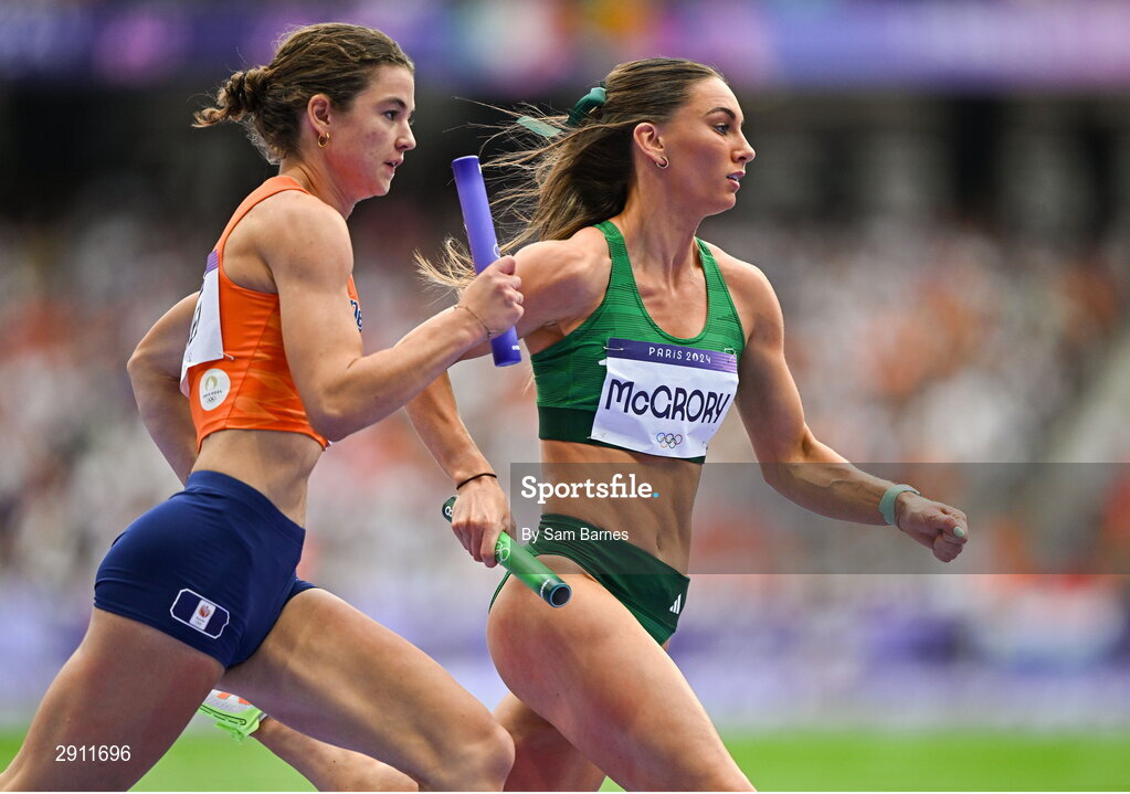 9 August 2024; Kelly McGrory of Team Ireland, right, and Myrte van der Schoot of Team Netherlands in action during the women's 4 x 400m relay round 1 at the Stade de France during the 2024 Paris Summer Olympic Games in Paris, France. Photo by Sam Barnes/Sportsfile