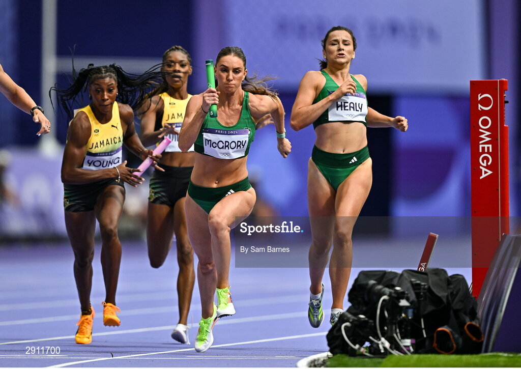 9 August 2024; Kelly McGrory of Team Ireland receives the baton during the women's 4 x 400m relay round 1 at the Stade de France during the 2024 Paris Summer Olympic Games in Paris, France. Photo by Sam Barnes/Sportsfile